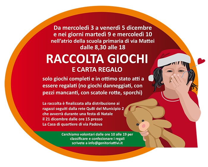 la festa e la distribuzione dei giochi si terra’ DOMENICA 21 DICEMBRE PRESSO LA CASA DI QUARTIERE DI VIA PADOVA dalle ore 15.00